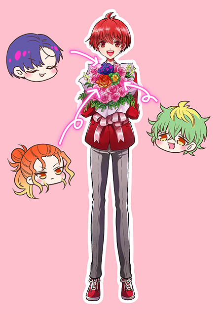 描けるキャラクターは1人、という事だったので、優に三姉妹カラーの花を持たせてみました。