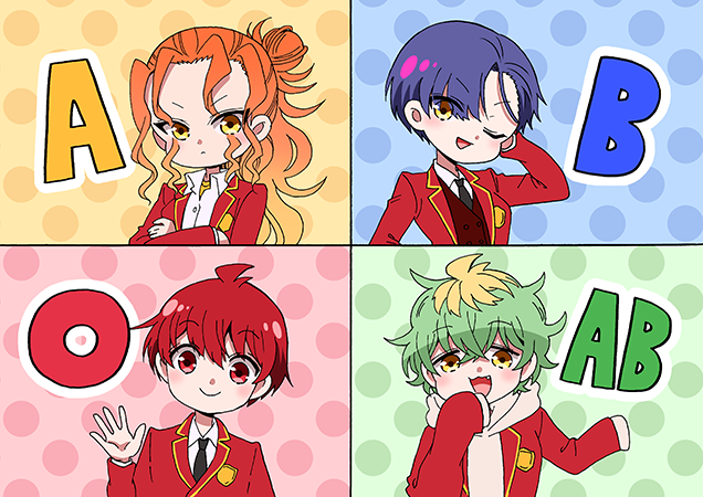 ↑今回のイラストは、帝乃三姉妹と優の血液型表です。