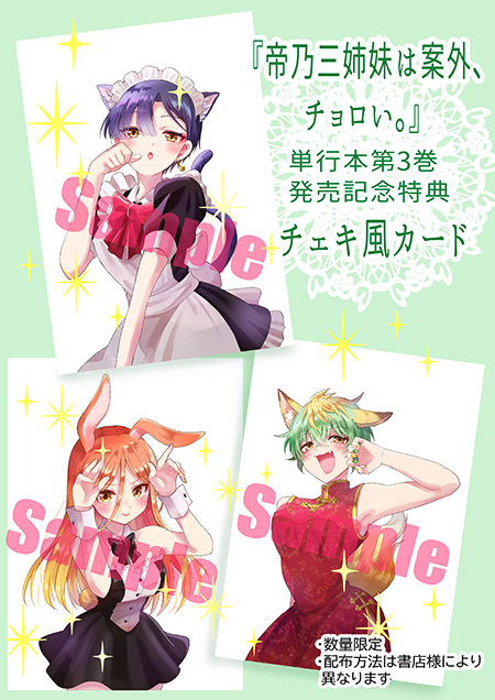 前回お知らせしたイラスト特典とは別で、今回の特典は、帝乃三姉妹の単行本1~3巻いずれかを買うとついてくるチェキ風カードです!!