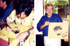 翌日はもうイタリア最後の夜。最後だからってんでイタ飯屋(当たり前か)ですっかり酔っぱらって、高いワインをガバガバ頼んでたら、店のシェフが出てきて「お前らはこんなにたくさんワインを飲んで、いったい何者だ」って聞いてきた。「日本の漫画家だ」って答えたら、「それなら、ぜひサインを描いてくれ」と言う。調子に乗ってコナンの絵付きのサインを描いたんだけど、何しろメチャクチャ酔っぱらってたんでへなちょこコナンを描いちまった。もしベニスに行くことがあれば「コルテス・スコンダ」って店に行ってみると、ちょっと変わったコナンがみんなを迎えてくれるかもしれないよ。