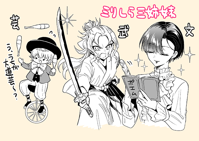 そこでの一幕で、三姉妹がそれぞれどの才能に秀でてるか当てるというのが面白かったので、描いてみました笑