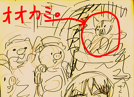 だいたい普段の動物はこんな感じで描いてるので、先週の作画はキバりすぎてブタとオオカミの絵柄がだいぶん違ってしまいました;