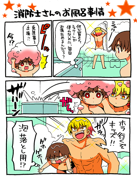 ↑消防士さんのお風呂事情は他にも、イラストみたいに入浴中に出場がかかった時、すぐに服が着られるように、計算して服を脱いであったりします。