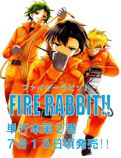消防士漫画『FIRE RABBIT!!』(ファイヤーラビット)、第2巻の表紙は月ヶ瀬、金森、シナの3人です!!