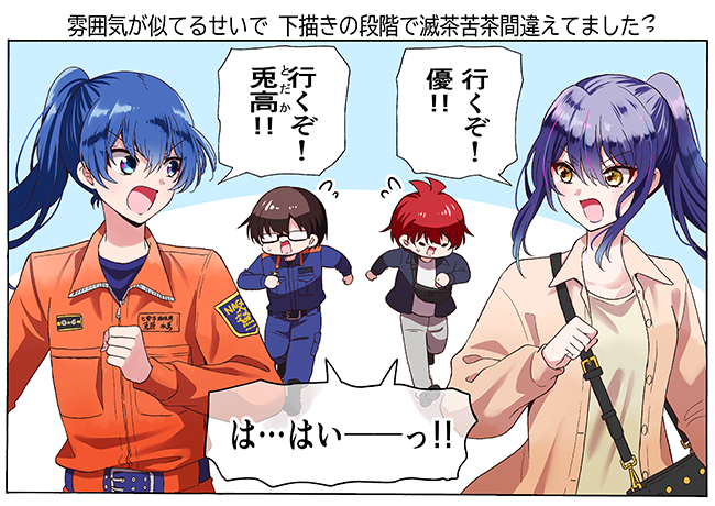 今回のイラストは、左半分が前作の『FIRE RABBIT(ファイヤーラビット)!!』のキャラクター達です。